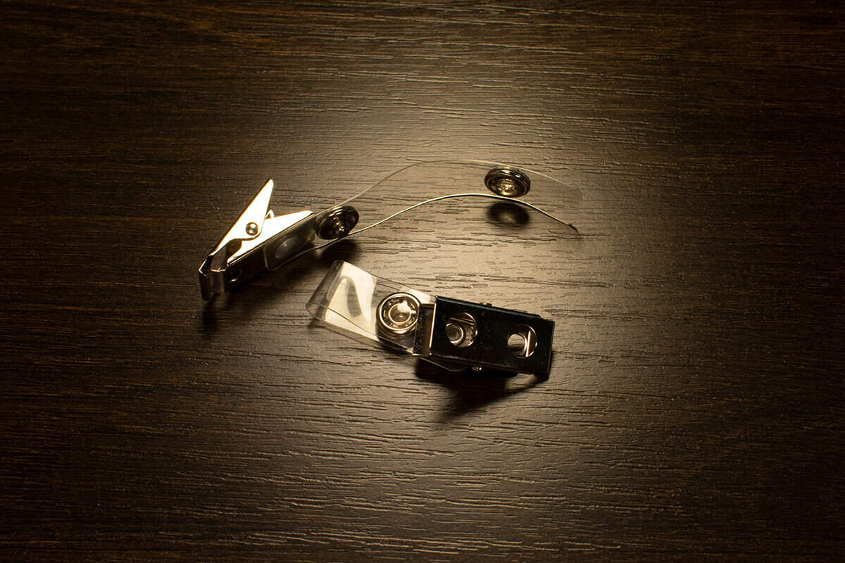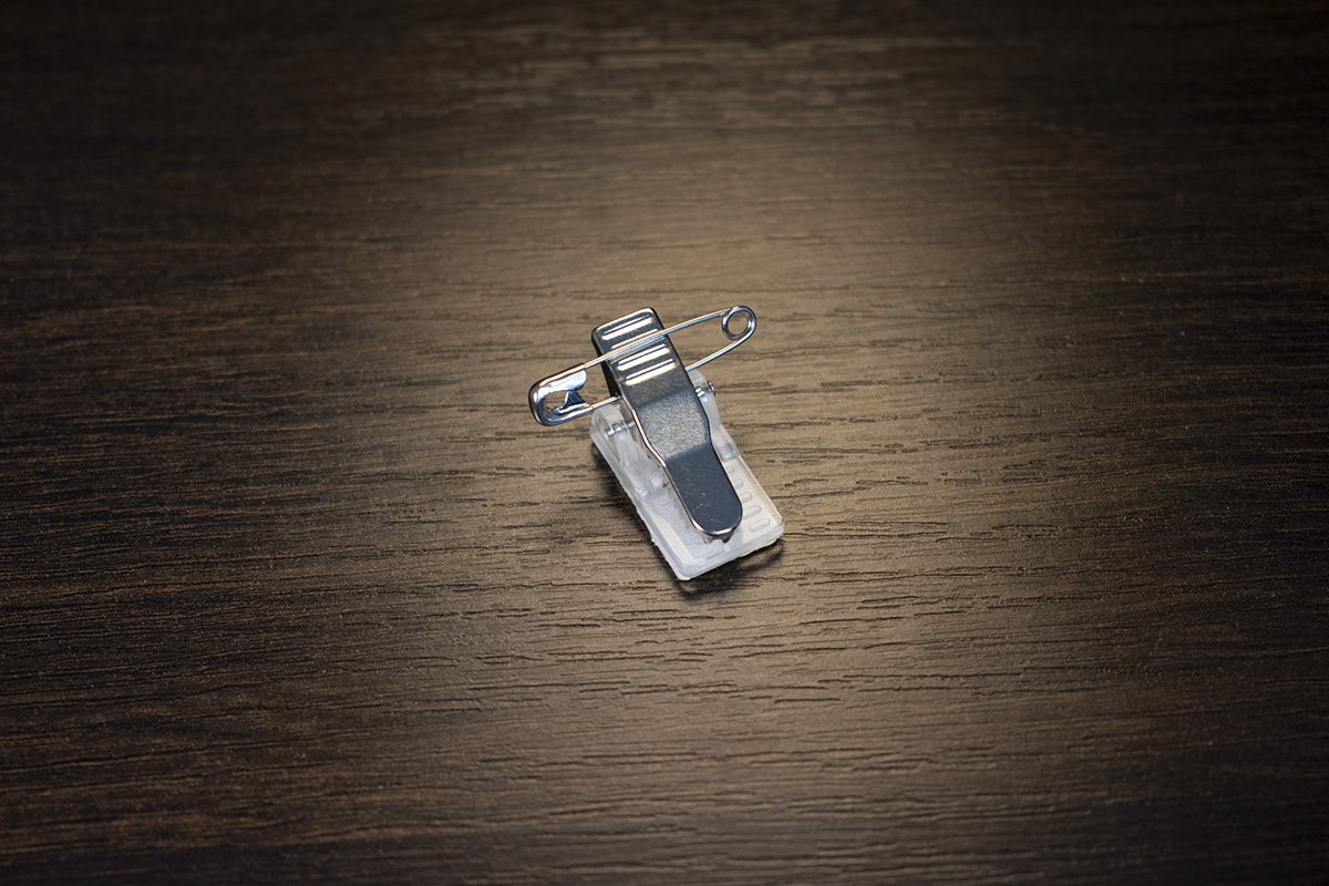 В бейджах на магните применяют пару магнитных клипс, их крепят одна к другой через любой материал, нет необходимости прокалывать одежду. Метод крепления на булавке предусматривает прокол ткани.